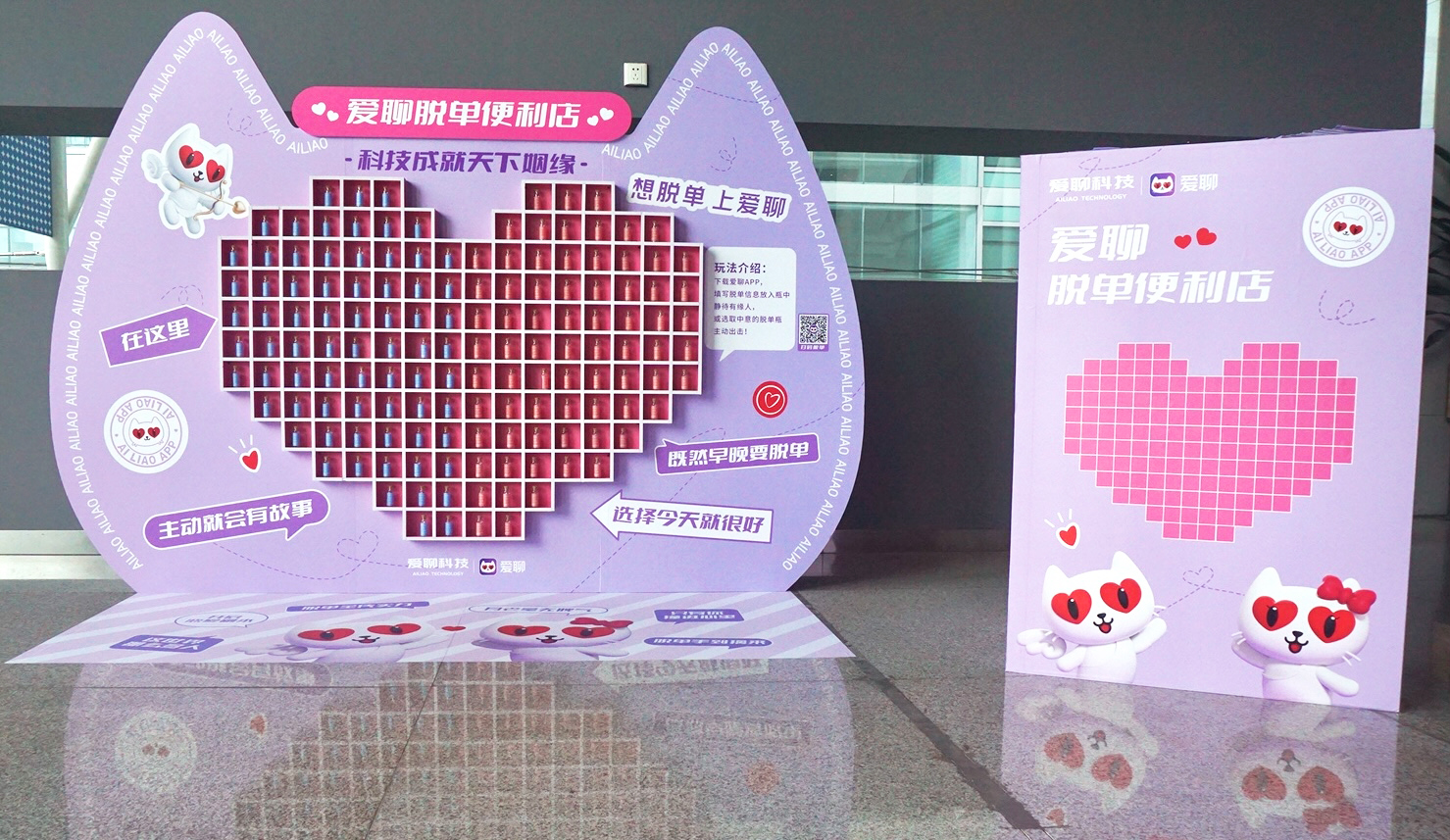 满墙的脱单瓶以月份为分类搭建为超具浪漫色彩的爱心形状,并根据男女性别分为蓝、粉两色,脱单瓶外展示了用户生日、家乡、个性签名等基本信息。来访的人员只需扫码下载爱聊 APP 即可填写信息放入脱单瓶,或从爱心墙中领取中意的脱单瓶,让“爱情转角来相遇,主动就会有故事”的美好憧憬得以实现。